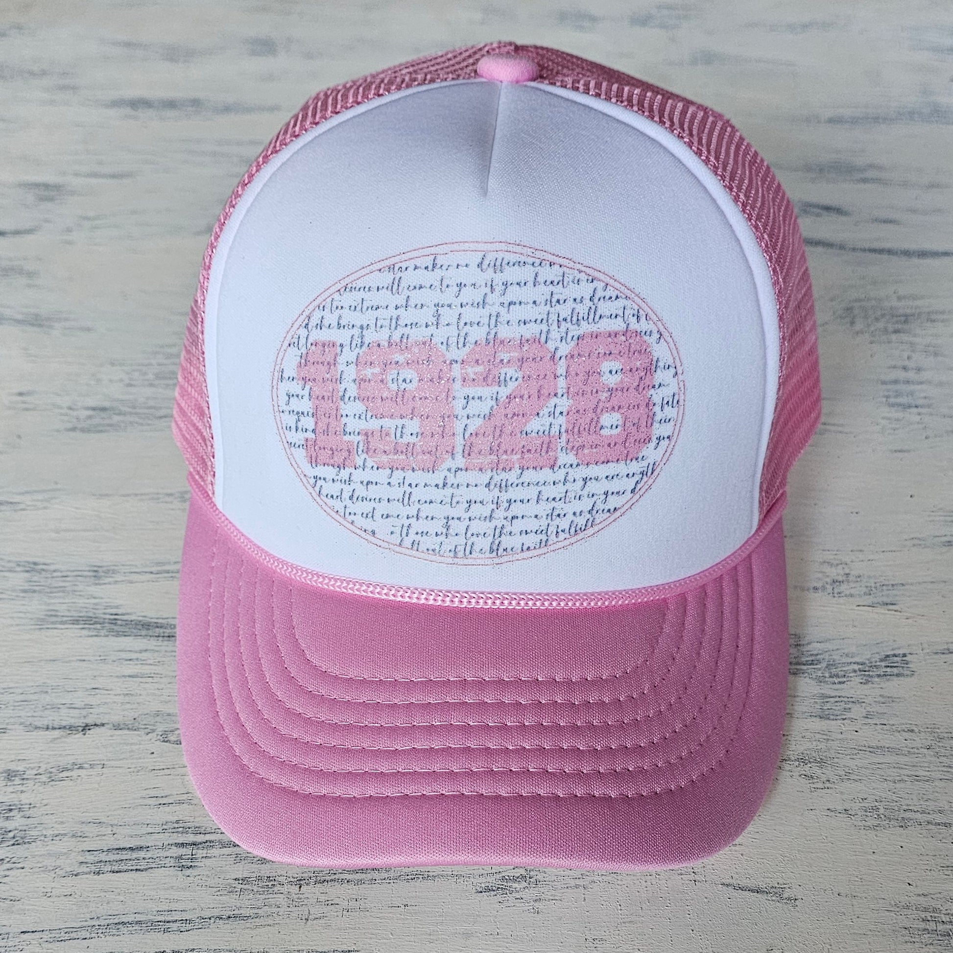 Pink trucker hat with pink 1928 and navy-blue words with the slightest shimmer!