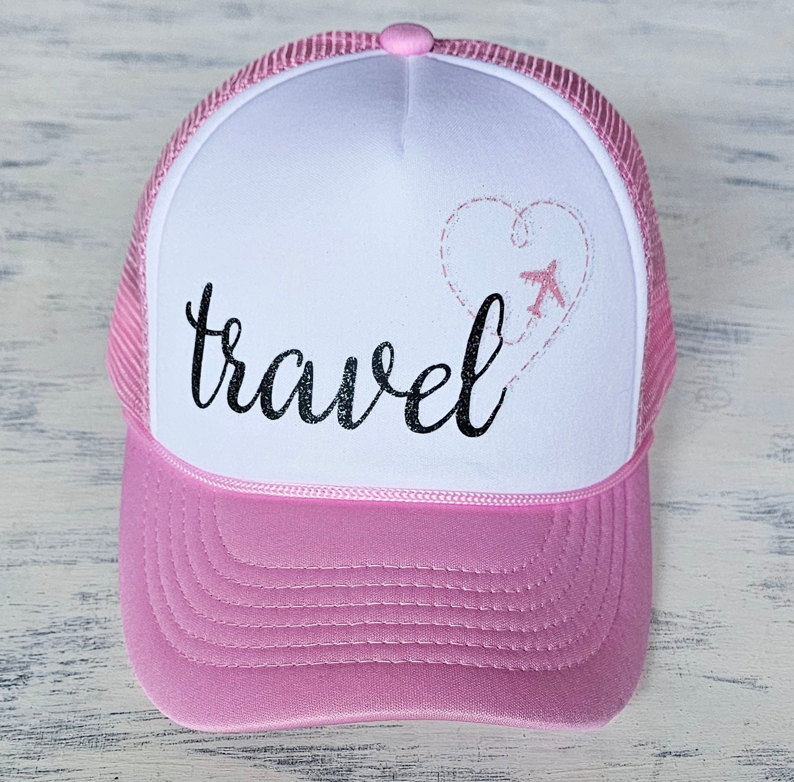 Pink hat with black travel and pink heart/plane with the slightest shimmer!